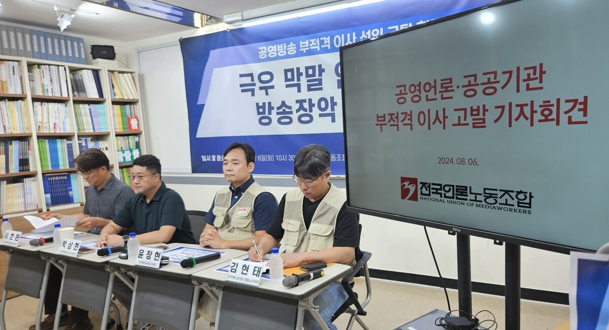 전국언론노동조합은 6일 서울 중구 프레스센터에서 '공영방송 부적격 이사 선임 규탄 기자회견'을 열고 방문진과 KBS 새 이사를 검증한 자료를 발표했다. 이들은 이번 공영방송 이사들이 '극우' '반노조' '언론탄압'이라는 유사점을 가지고 있다고 지적했다.
